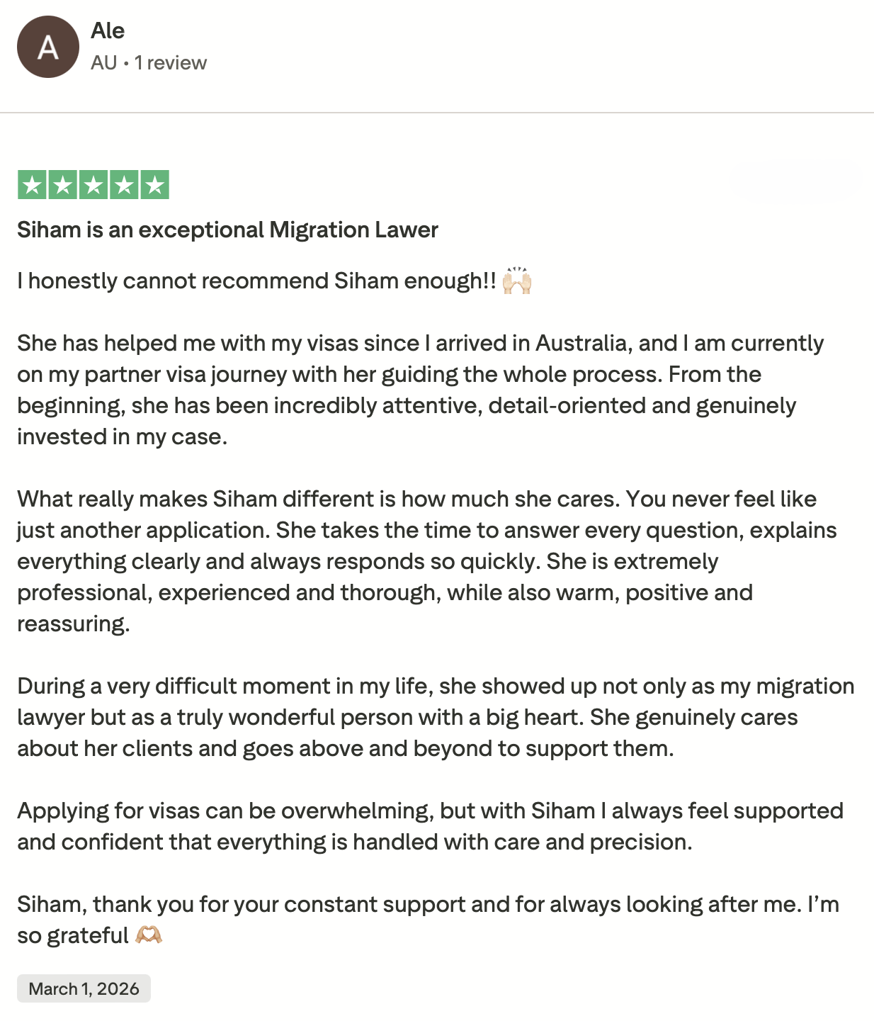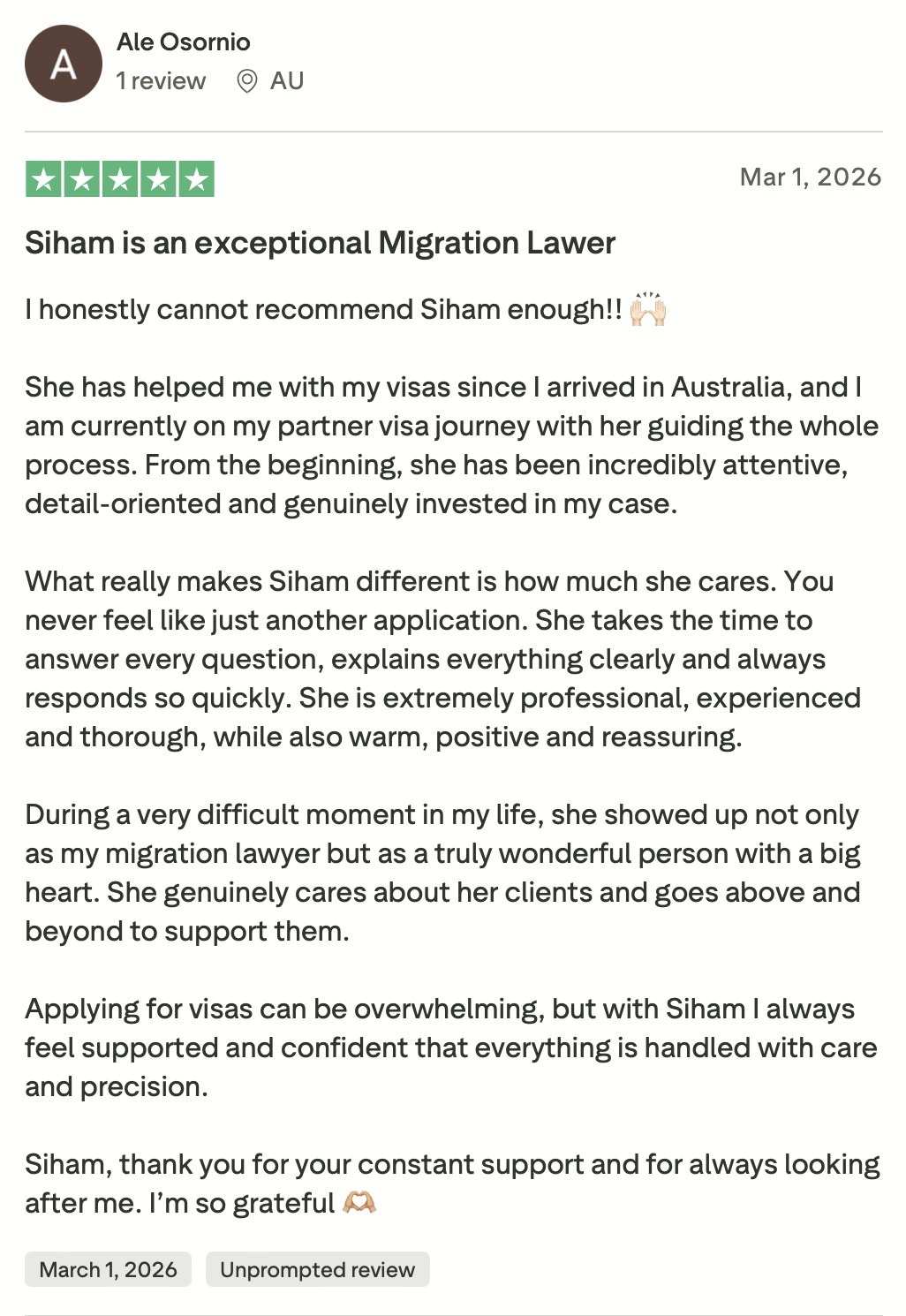 We are proud to be recognised as a trustworthy Australian Migration Agent, with clients consistently sharing their positive experiences on Trustpilot, we invite you to read their stories and see why so many people choose us with confidence.